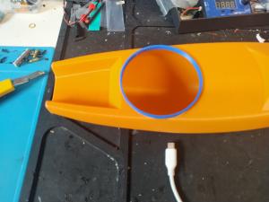 Als Basis diente das Green Hornet Footy von Thingiverse. Wegen der Maximalen Druckhöhe wurden alle Teile auf 66% runter Skaliert. Gedruckt wurde auf dem Heck stehend im Vasenmodus, wobei im Slicer die Druckbreite auf 1.0mm sowie der Flow auf 120% erhöht wurden. So erreicht man trotz 0.4er Düse einen sehr steifen und Wasserdichten Druck. Das Ruder wurde ebenfalls auf 66% verkleinert und im Vasenmodus gedruckt, anschließen wird der obere Bereich passend zur Rumpfkontour abgeschnitten. Nachträglich wurden die Ausschnitte im Rupf für Servos und Kiel geschnitten. Oben ins Deck kamen die beiden 9g und 5g Servos, in den Rump ein kleiner ELRS Empfämger sowie ein 1S Lipo. Zugänglich sind diese durch herausnehmen des 9g Servos. Um die Servos wurde eine Dichtschürze aus TPU gedruckt.