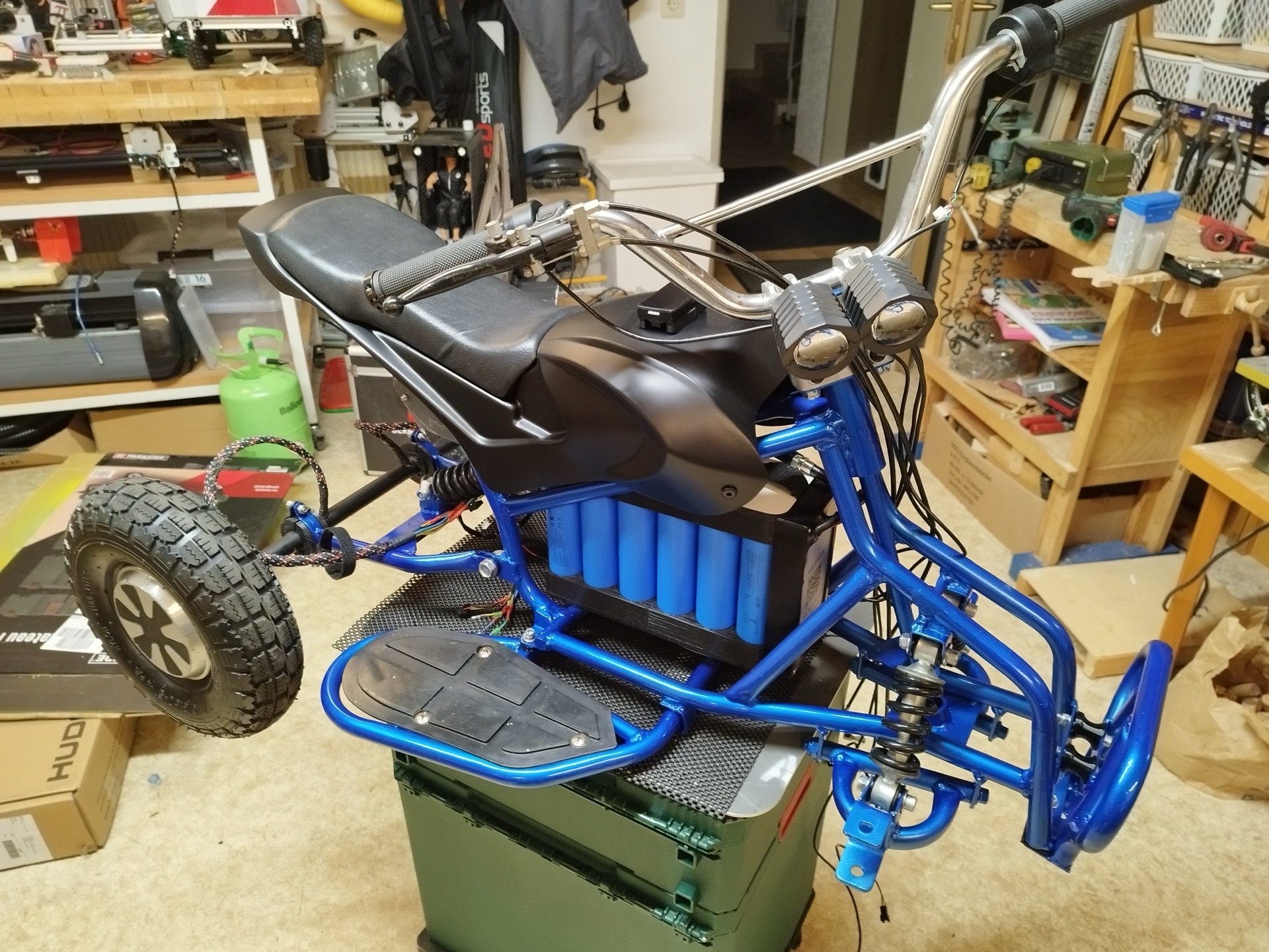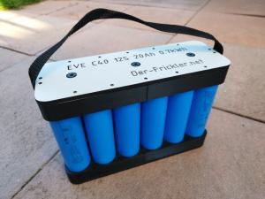 The Battery is a DIY 12S LiFePo4 pack build from EVE C40 Cells from NKON cells. Its ~36.4(40)V, 20Ah resulting in over 0.7kWh. The Cells are cased in 3d printed holders, coversd by 6mm HPL Plates. A JK-BD6A24S8P JK-BMS manages cell balancing and protection.